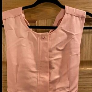 You're looking at the Twist Open-Back Dress in pink designed by Carven. This Mini dress features a stripes & squares print and is made of a fabric developed by Maison Carven. Structured flared shape that gathers at front and comes with a twist open back highlight. Buttons on the front of the dress. Back button welt pocket. Side slits.