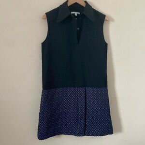 This is a sleeveless, two-tone A-line mini dress with a modern, preppy feel. The top portion is a solid black with a classic pointed collar and a partial button placket, giving it a polished, shirt-inspired look. The lower portion features a textured woven fabric in a navy base with subtle red and white diagonal accents, adding visual interest and dimension. The skirt section has a slight flare for ease of movement. This dress combines tailored sophistication on top with a playful, patterned skirt, making it versatile for both work and casual occasions.