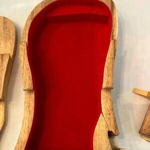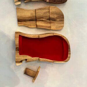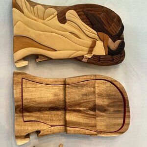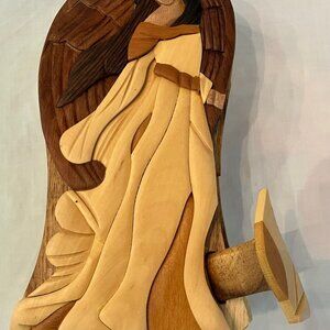 This is a handcrafted puzzle box made in Vietnam from exotic hardwoods, a beautiful decor item and which has a small velvet-lined interior to hold jewelry or trinkets. This box is truly a beautiful piece of handiwork - it's carved with care, the combination of hardwood colors is very pleasing, and it feels extremely smooth to the touch. There is a hidden "key" on the lower right folds of the angel's dress, when raised it allows the top part of the box to slide off to the right or the left, revealing the top lid of the secret velvet-lined compartment. This puzzle box is in excellent condition! It looks like new, with no defects noted. This would make an excellent gift for someone special.
