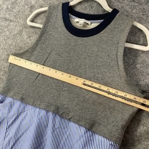 Features: mini dress - sweater knit design at the top, sleeveless, woven blue striped skirt with an asymmetric layered front design, pullover style