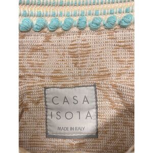Casa Isota" is a brand of luxury handbags known for its handcrafted Italian designs that embody the Mediterranean lifestyle. The brand's products, including totes like the one pictured, are designed in New York and meticulously crafted in Italy using traditional Sardinian weaving techniques
