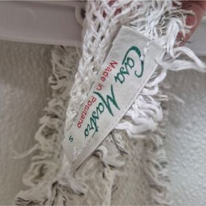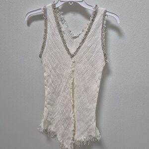 V neck tank with fringe trim and distressed hems and split in the middle bottom of tank on front and back to make it breezy Hem is angled see pics and top of Shoulder to end is 23 in to 28 in depending on where you measure on the angle.