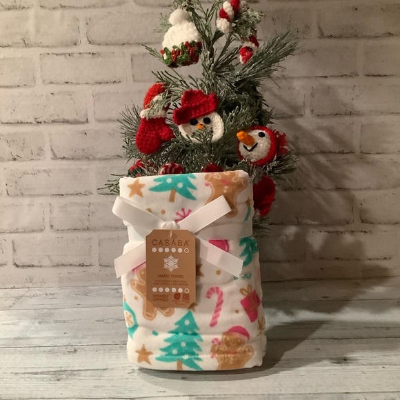 NWT, set of 2, white with multi colors, soft textured, gingerbread man, tree, and candy cane motif Christmas hand towels.