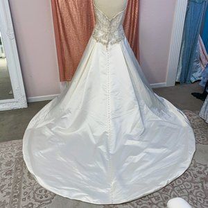 "This classic Casablanca Bridal gown features a soft sweetheart neckline and intricate beadwork and embroidery. The A-line Sleek Satin skirt has pockets; while the back of the skirt is accented with box pleats and matching satin buttons down to the end of the train. This gown features an inside hook and eye fit panel."