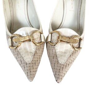 Casadei Beige Woven Leather Gold Horse Bit Heels