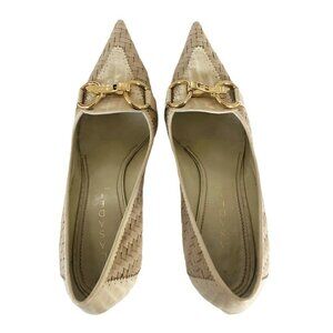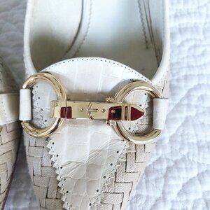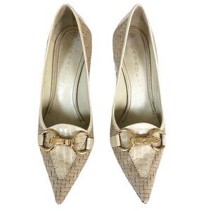 Casadei women's high heel pumps. Heels are made of beige woven leather with croc embossed tan detailing on toes, around rim and on back of the 3" heel. The pointed toes have gold horse bit accents. Heels are a woman's size 10.5. Made in Italy