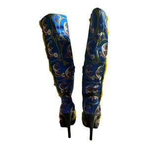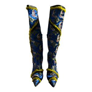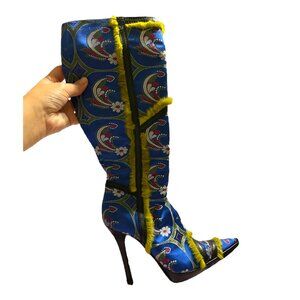 Showstopper Casadei boots in smooth genuine fur and leather offering a unique luxury wardrobe staple. These boots are guaranteed to make you stand out with the electric blue/green color and floral design. Don't miss your chance to own these one of a kind boots.