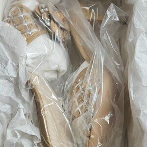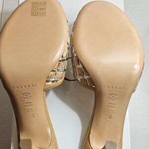 Gorgeous, never worn, mid heel leather open toe mule with silver leather and cork flower. Perfect for resort and summer wear. 38 1/2=8.5 true to size. Made in Italy