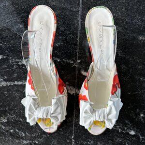 Casadei White Retro Mule Women's Sz 6.5 Canvas Floral Classic Open-Toe Sandal Heels