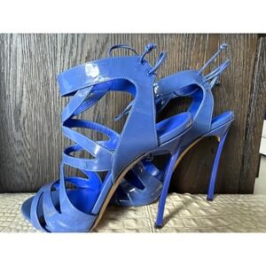 Step into statement style with these striking Casadei cobalt blue patent leather stiletto sandals. Made in Italy, these heels feature cutout strappy details, an ankle tie closure, and Casadei's signature sleek high heel silhouette. Perfect for nights out, parties, or styling with a bold fashion-forward look. Size 9.5 B
