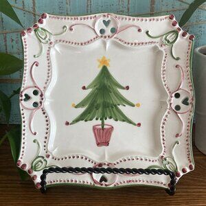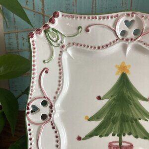 The Casafina Buon Natale Christmas Tree 7.5" White Handpainted Plate is a charming and festive piece perfect for holiday gatherings. Made of porcelain and handpainted in Portugal, this square-shaped plate features a multi-color Christmastime pattern with a tree theme. The contemporary original design adds a touch of art pottery to your table setting, making it a unique and handmade addition to your holiday decor. Perfect for serving holiday treats or as a decorative display, this plate from the Holiday product line by casafina is sure to bring a touch of Christmas cheer to your home. Note very minor crazing in corner, pictured.