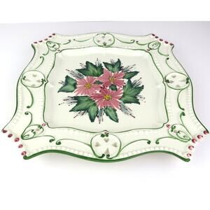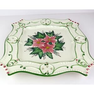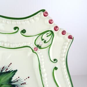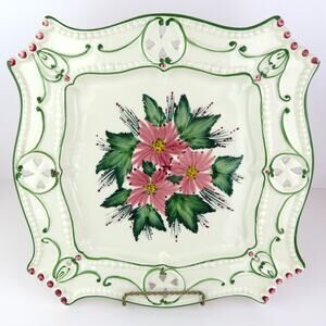 This beautiful Casafina hand-painted ceramic platter, made in Portugal, features a floral design in shades of pink and green. The pierced “lace” style edging, raised beading, and scalloped silhouette give the piece an elegant cottage-inspired, artisan look. Perfect for serving, display, or adding a charming vintage accent to your home.