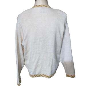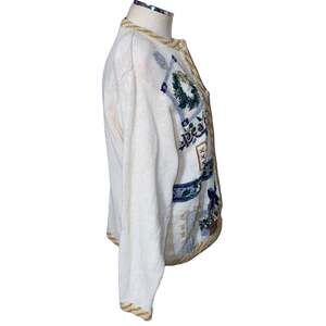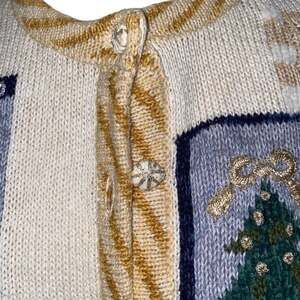 Cascade Blues Vintage Button Front Ugly Christmas Sweater Cardigan size large with fabric button covers. Has PEACE spellout with ornaments, wreaths, Christmas trees, gold stars patterns and bows and much more. In beige and gold colorway and gold fabric snowflake textured buttons. As with any vintage item, this has been used and may show signs of wear. Please look carefully at the photos and feel free to ask any questions. 55% Ramie, 45% cotton