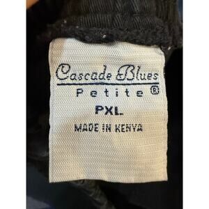 Vintage Cascade Blues Petite denim capri pants in women's size PXL. These classic mid-rise capris feature a comfortable elastic waistband, no pockets, and a pull-on style. Made in Kenya from soft, stretchy denim. Great for casual wear, everyday comfort, or a retro 90s-inspired look.