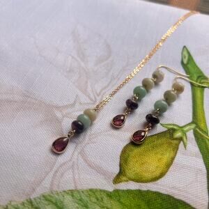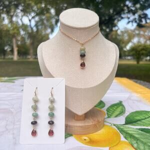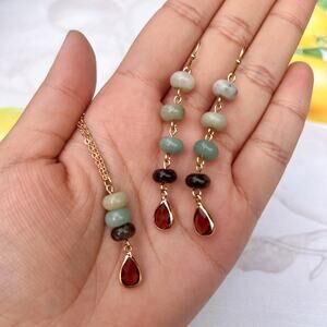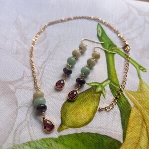 Gold earrings and necklace features a soothing, cool green/blue/red gradient of jade beads with garnet crystal glass teardrops. Chain is adjustable 15-18".