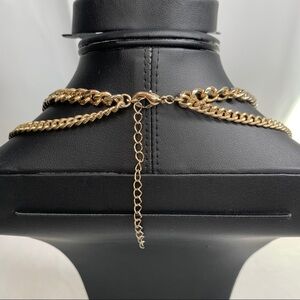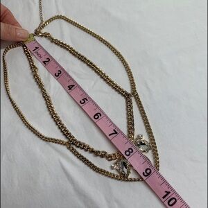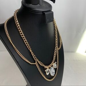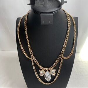 A beautiful unique statement necklace comprised of tiered gold tone chains with a trio of large crystals at the center. A real attention grabber! Looks amazing in front and from behind.