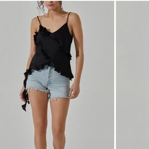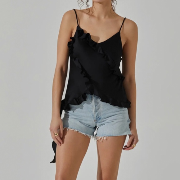 Cascading ruffles trail down the body of a woven tank that instantly updates any ensemble.