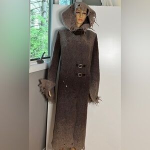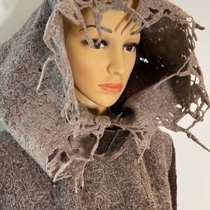 This is an amazing Casch by Gro Abrahamsson Sz 38 Boiled Wool Coat - this is like wearing a work of art. Very warm. Boiled wool shows like a swiss cheese holes, but that is the intent of the design. Super cozy and lightweight yet warm. Closes with a cool attached leather belt at the neck that is attached with loops when open. Two smaller belt straps that are also adjustable straps at the waist. Very deep hood and extra long sleeves that are slit in the interior are all for effect. The color is a neutral gray taupe that is almost an ambre effect. No tears. No stains. No odors.