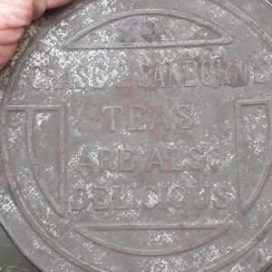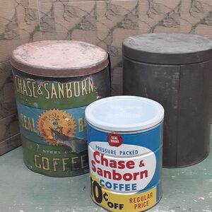 Vintage Chase & Sanborn's Lidded Storage Tin Coffee Canister. This is a vintage tin from Chase & Sanborn. Stamped on the lid "Chase & Sanborn's Teas are also delicious." Lid fits very tightly but is removable. There originally was a label attached as evidenced by the signs of glue on the side of the canister. Chase & Sanborn Teas are also delicious coffee tin- green patina vintage. Looks like around 4-5LBS. can.