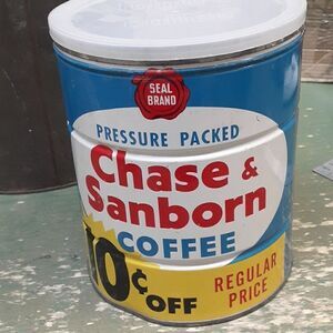 Vintage Chase & Sanborn metal Coffee Can Tin 2 lb. display tin. (Has Folgers coffee plastic lid). Does have a little corrosion inside of tin.