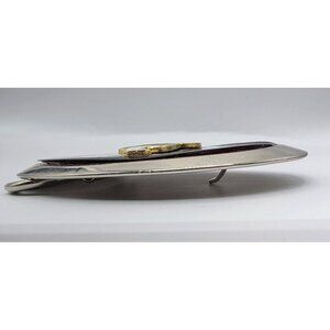 This belt buckle is preowned. The belt buckle is silver toned, and the red area is a acrylic I believe. It does look like the red acrylic area isn't completely flushed to the metal buckle. It might need to be glued down again if it comes loose. It does look like it has come loose in the past and was glue back on. The red piece isn't completely flush on the metal buckle. It isn't noticeable unless you run your hand over it. The eagle sitting on the globe with the Case logo is Cloisonne enamel.