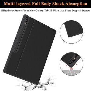 Shockproof Soke case for Samsung Galaxy Tab S9 Ultra 2023 / S8 Ultra 2022, designed with a convenient S Pen holder. The soft TPU back cover provides ultimate protection for your 14.6-inch Galaxy tablet. Its sleek black design enhances the aesthetic appeal of your device.