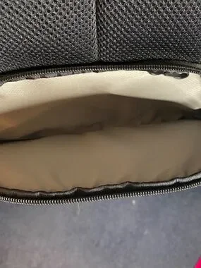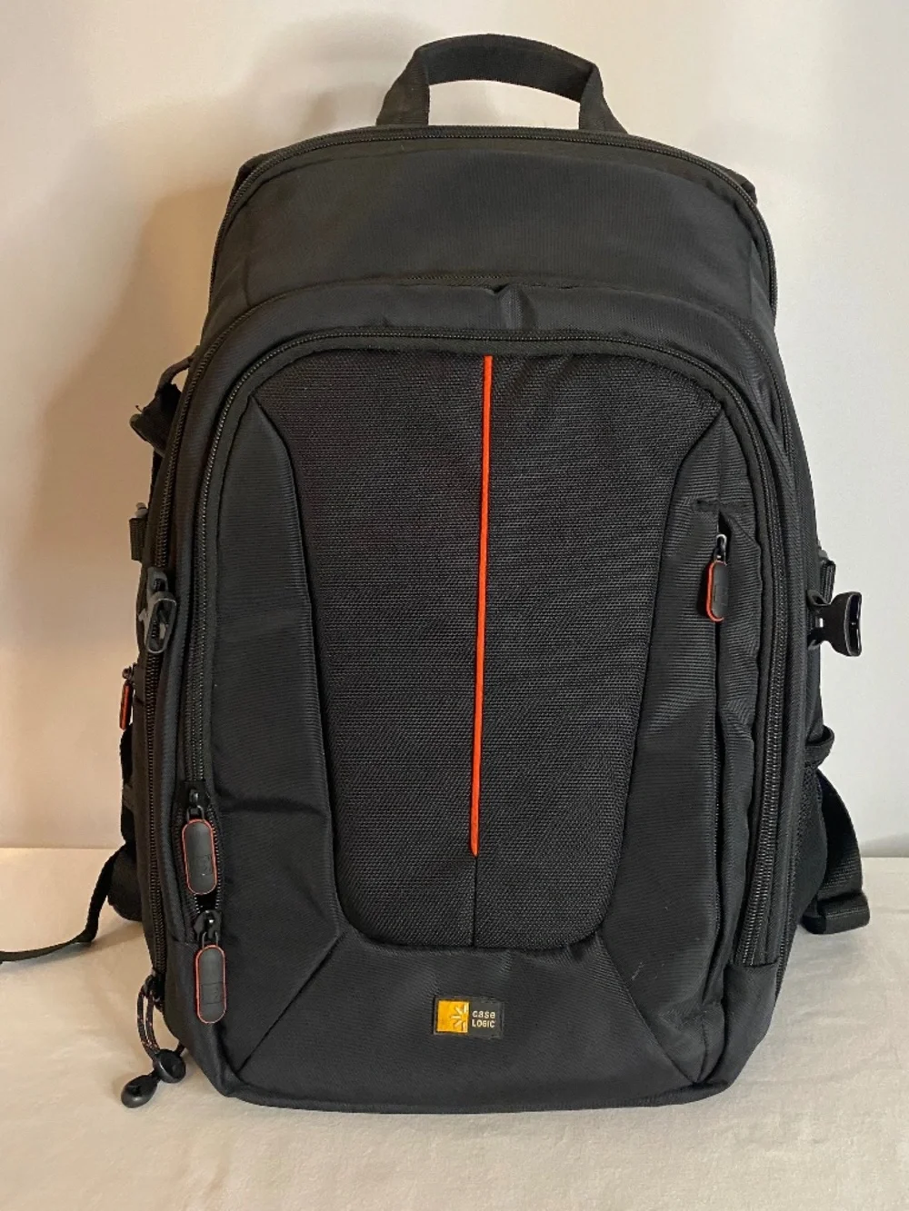 Camera backpack by Case Logic. Black bag with orange interior. Couple of pockets in front, small zippered pockets on sides and back. Main part of bag is padded and has dividers for lenses. Large padded pocket behind the main part of the bag. Also padded, could hold a laptop. I did use this to store my camera and accessories. Bag size 14x15. Bag is in excellent condition. No tears or stains.