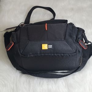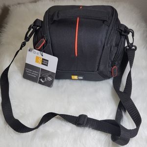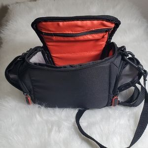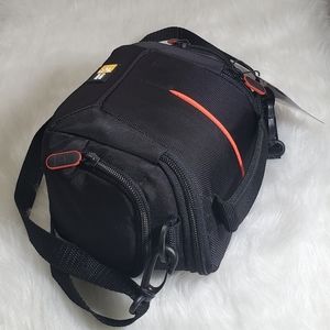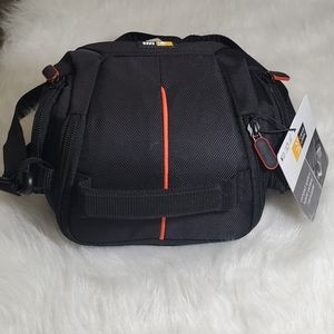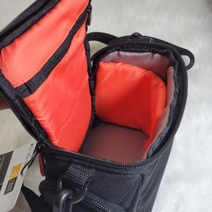 Zippered accessorie pockets, internal zippered pocket, with extra padding for camera lens. Belt loop easy detach from case. Comfortable carrying strap, black case with orange lining. Brand New with tags.