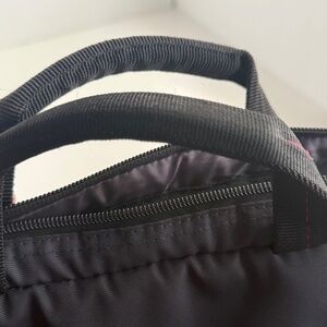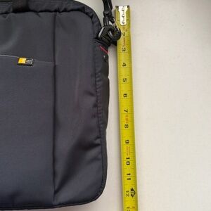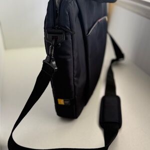 Case Logic black computer back with removable and adjustable strap. It has a front pocket with velcro closure. The back side has a strap with velcro. Top zipper closure with internal pockets for cables, phone, etc. In excellent condition.