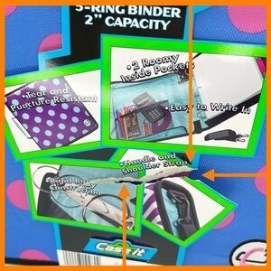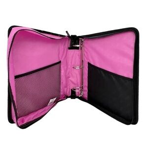 Description: Three ring binder with 2” capacity | Zip around closure | Interior three-ring binder with 2 inch capacity | Interior left side features an open top netted pocket and the right side an open top nylon pocket | comes with and adjustable, detachable shoulder strap