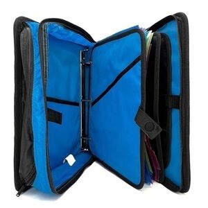 Description: Dual, three D-ring binders - each measuring 2” - for a total of 4”, 600 page capacity | Zips around three sides to close completely | One exterior zippered pockets (on the front) measures approximately 4” by 11” | D-ring closures | Hand carry with handle or over the shoulder with strap | Interior compartment features one slip pocket on front wall; a 5-color tabbed, expanding, removable file folder with a netted pocket for smaller supplies; and a removable three ring organizer with various pockets on front and back