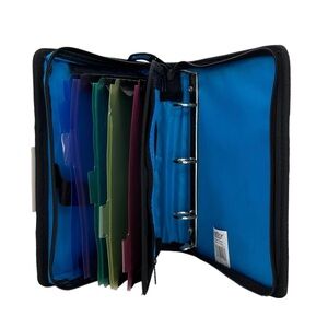 Description: Mini three binder holds A3 / 5.5″ x 8.5″ paper with 1” capacity | Zips around three sides to close completely | One exterior zippered pockets (on the front) measures approximately 4” by 8” | Interior compartment features a 5-color tabbed, expanding file folder with a netted pocket for smaller supplies