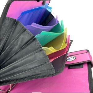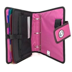 Description: Three ring binder with 2” capacity | Hook & loop tab closure | Interior right side features round, three-ring binder with 2 inch capacity | Interior left side features attached five-color tabbed expanding file with a zippered netted pocket for smaller supplies