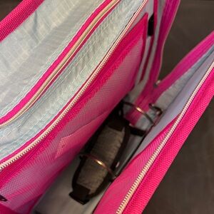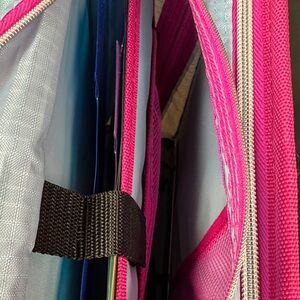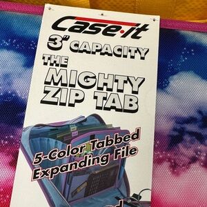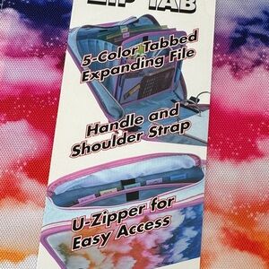 Vibrant expanding file organizer with a handle and shoulder strap. Features a U-zipper for easy access.
