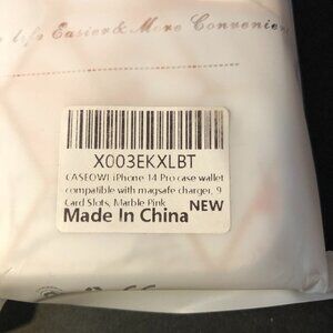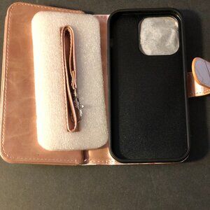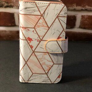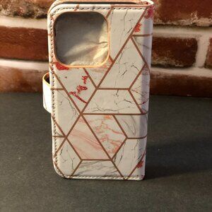 NEW! Marble pink iPhone case/wallet. Case is compatible with iPhone 14 Pro, 6.7” display, three cameras, and magsafe charger. Case includes 9 slots for card storage, as well as hand strap for easy carrying.