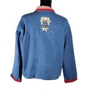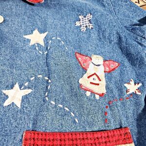An exceptionally cute jacket for the Angel in your life. Blue denim, button-up,100% cotton with Angels and stars on the front with 2 peach/pink corduroy pockets. The collar is trimmed in black/red flannel. The cuffs on the jacket have a 1" turned-up cuff trimmed in the same black/red flannel. There is one Angel on the back of the jacket. Excellent LN (pre-loved) condition. No signs of garment distress.