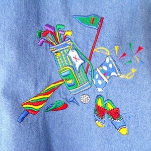 Whimsical Embroidered Golf Designs in the Front of the Shirt.