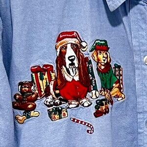 This Casey Coleman embroidered holiday denim shirt is a vintage item from the 1990s. The shirt depicts a festive holiday scene with dogs, such as a Basset Hound and a Dalmatian, along with presents and candy canes in rich colorful embroidery. Casey Coleman was a brand known for these types of whimsical, embroidered denim or chambray shirts, often with holiday or animal-themed designs.