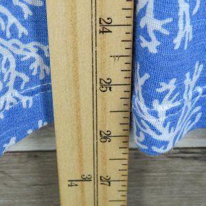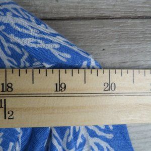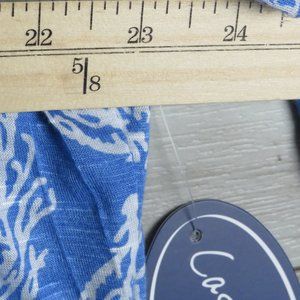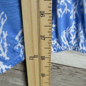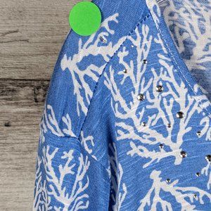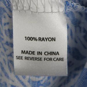 NWT~ Good Condition! 100% Rayon. Beautiful Lightweight Blue & White Blouse with Elastic Cuffs and Winter Tree Print Design (Silver Studded Sequins-Neckline). Even though it is NWT a small hole was left from the Retail Security Tag.