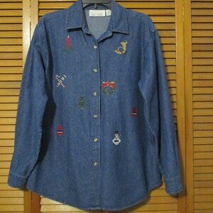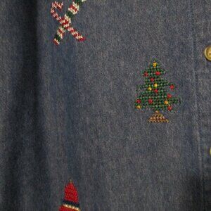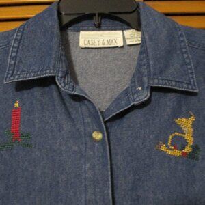 Casey & Max brand - Vintage blue denim jean Christmas button down top. Embroidered Christmas items on the front. 100% cotton. Great condition.