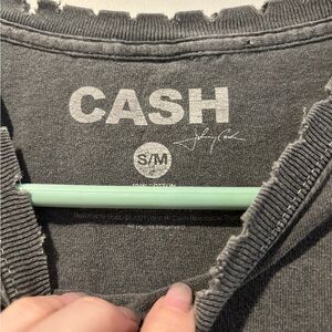 Gray t-shirt with 'Cash' graphic. Distressed edges for a rugged look.