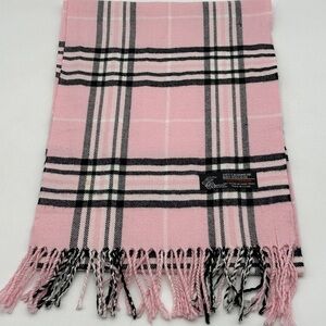 Cashmere Blend Scarf Pink Black & White Plaid With Fringe 68” x 12” Winter