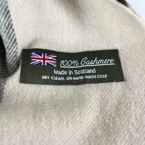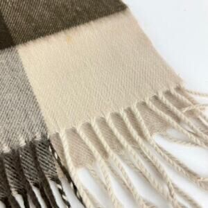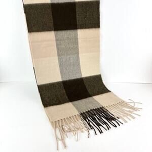Super soft 100% cashmere scarf, measures approx 12" x 64" in a brown and tan plaid.