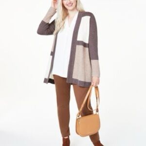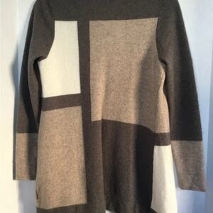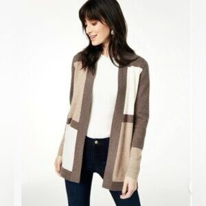 Stay cozy and stylish with this colorblock open front cardigan. Featuring a blend of brown, cream, and tan hues, this sweater is perfect for layering. Ideal for casual outings or a day at the office. 100%Cashmere size L