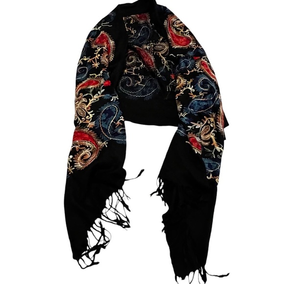 Cashmere Fringe Scarf Wrap with beautiful embroidery Black red gold blue paisley