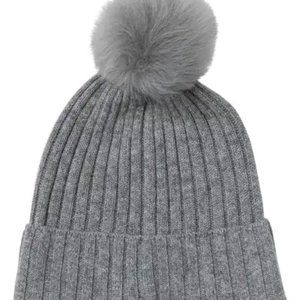 A super soft cashmere beanie features a genuine shearling pompom for cozy winter style.