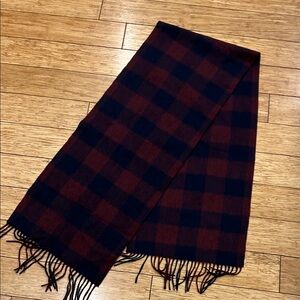 Soft and warm cashmere plaid scarf with fringe. Features a blend of dark cranberry and navy colors. 59”x12”