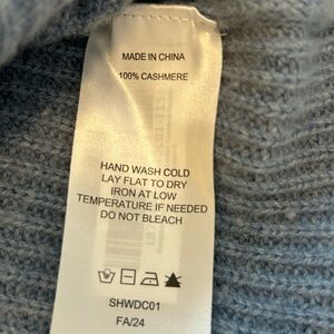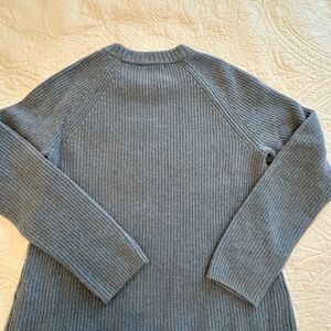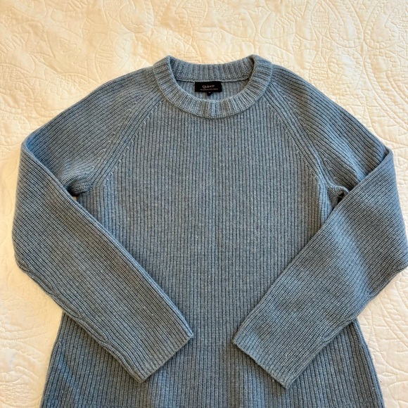 Soft cashmere sweater by Quince. Light blue ribbed texture. Ideal for comfort and style.