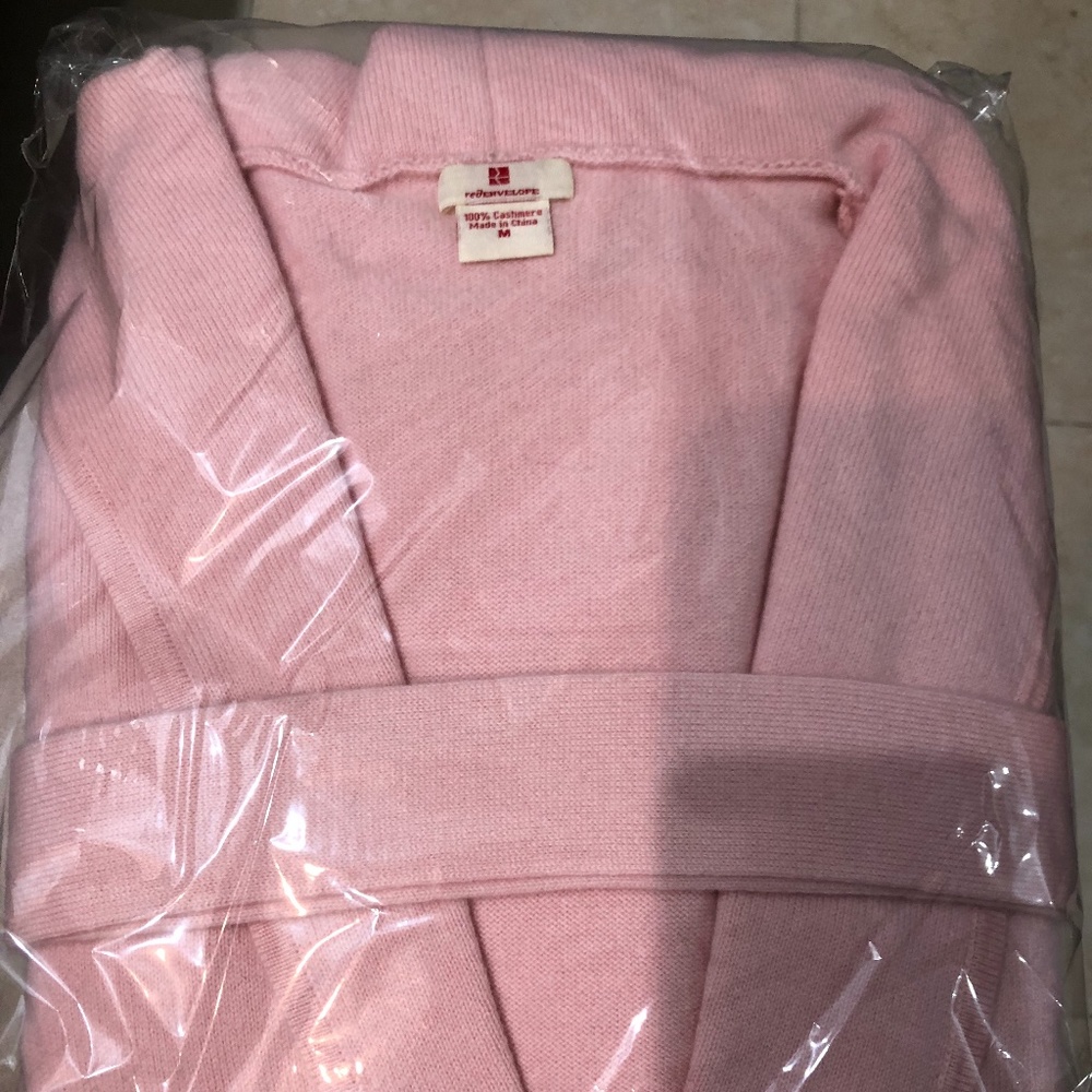 Cashmere ladies robe NIP that have never even been out of the box or plastic. Length is roughly 47" from the top of the back under the neck cowl. I received this as a gift and just never used. Very pretty soft pink color and size is medium. Beautiful luxury item from the Red Envelope company.
