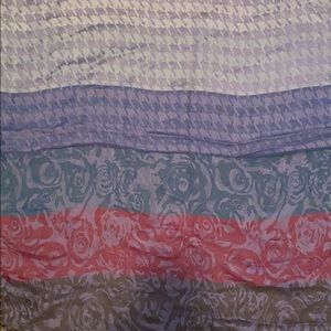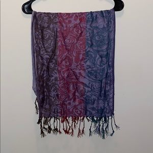 Multi-pattern/ colored cashmere scarf with fringe. Primarily red, purple, and green. Excellent condition. Purchased from high-end boutique.